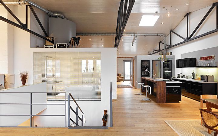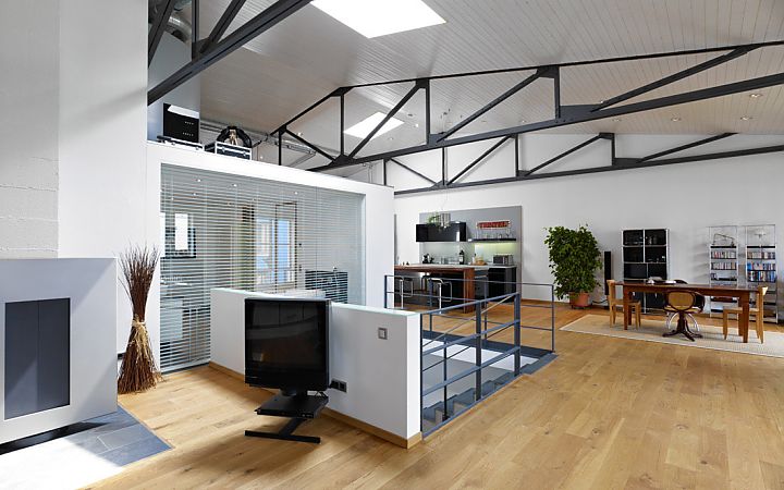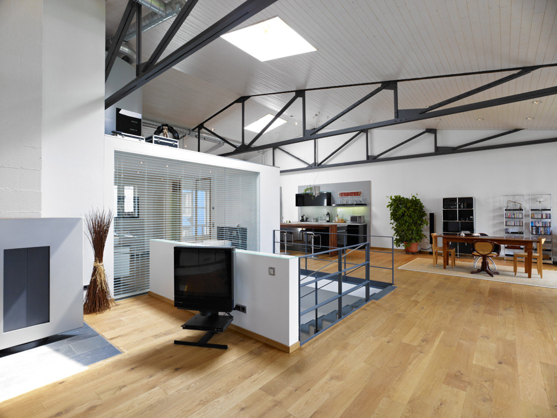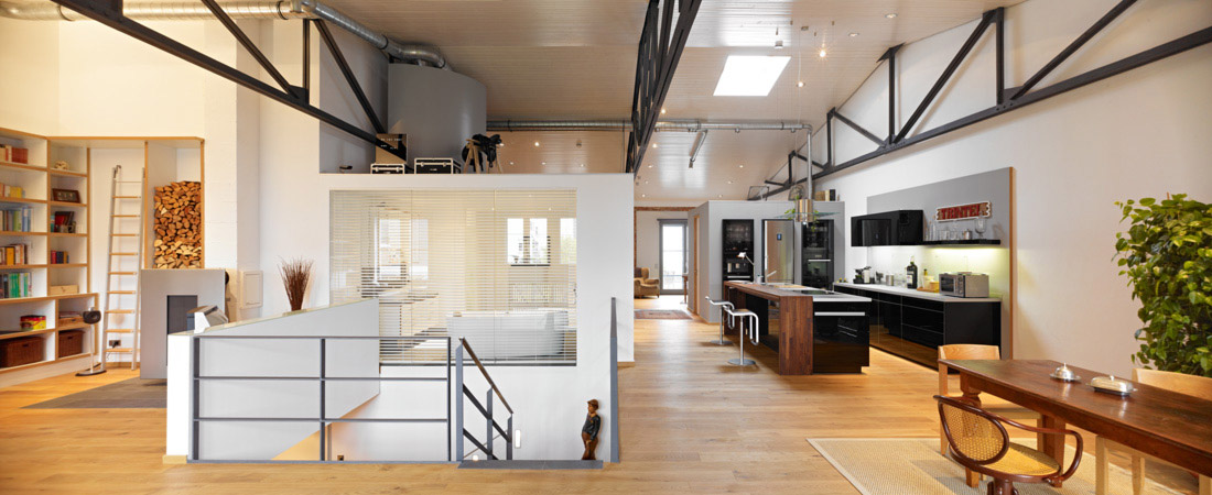 Der große Hallenraum bekam eine neue Zwischendecke auf Höhe Fenstergesims und nimmt heute im oberen Teil 5 Lofts und im unteren Teil Eingänge, Nebenräume und Garage auf. Die Lofts sind mit ca. 95 bis 250 m² großen Einheiten individuell zugeschnitten.