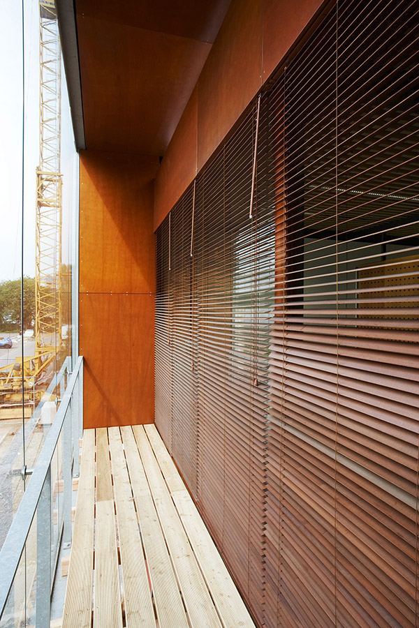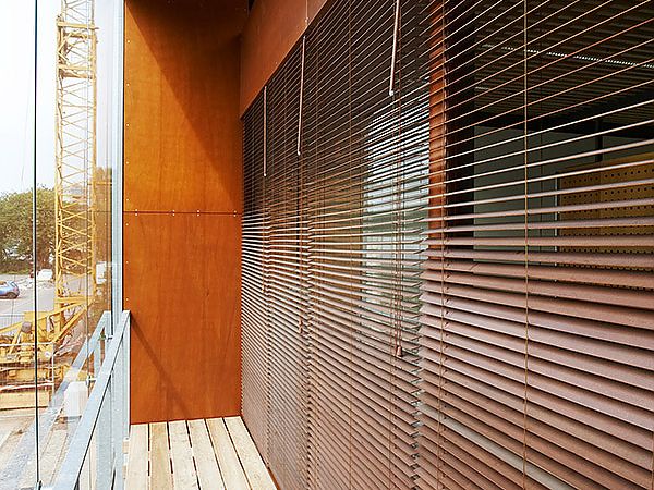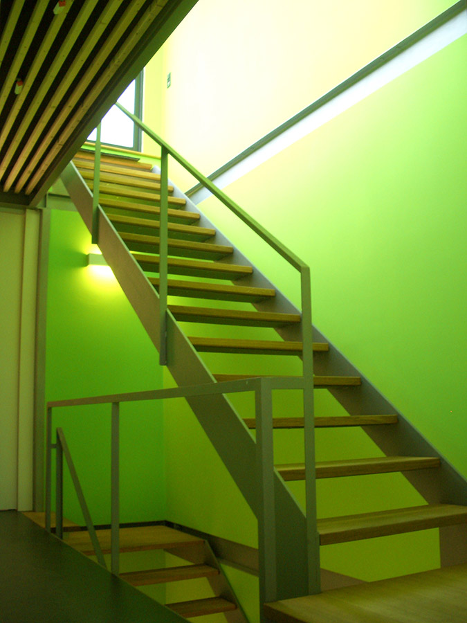Das Gebäude wurde in kurzer Zeit als Stahltragwerk mit Holzausbauteilen und Holz-Glasfassade errichtet. Vorgehängte Klimafassaden an Straßen- und Gartenseite unterstützen das auch gebäudetechnisch reduzierte und energieschonende Gebäudekonzept.