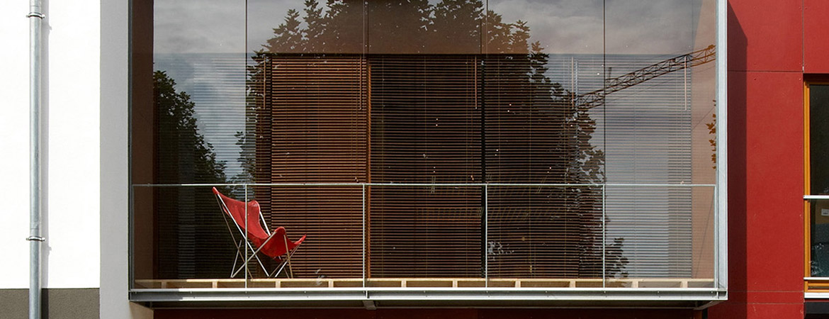 Außenbezüge sind mittels transparenter Fassadengestaltung auf allen Etagen gegeben. Vorgarten- und Gartengestaltung lassen auf kleinem Raum private Bereiche nutzbar zu.