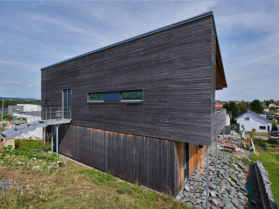 Das Wohnhaus als Holzständerbau sollte den Typus des einfachen Einfamilienhaus aufgreifen und innerhalb des typischen Neubaugebietes an die Bescheidenheit und Entschiedenheit beim Bauen in der Region erinnern.