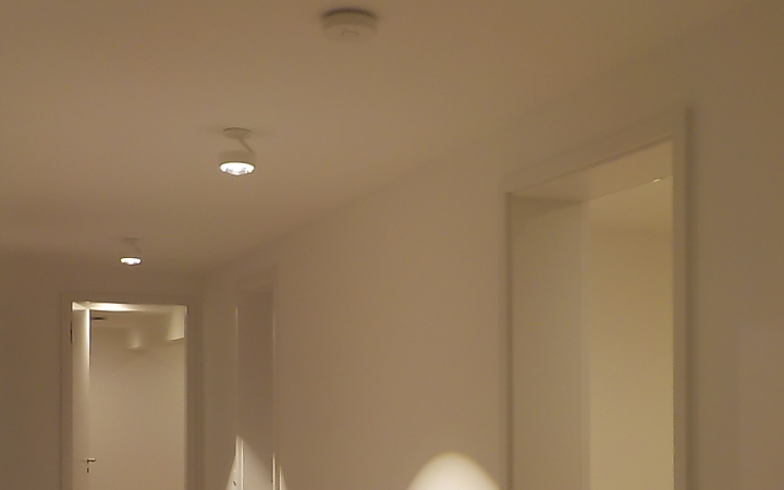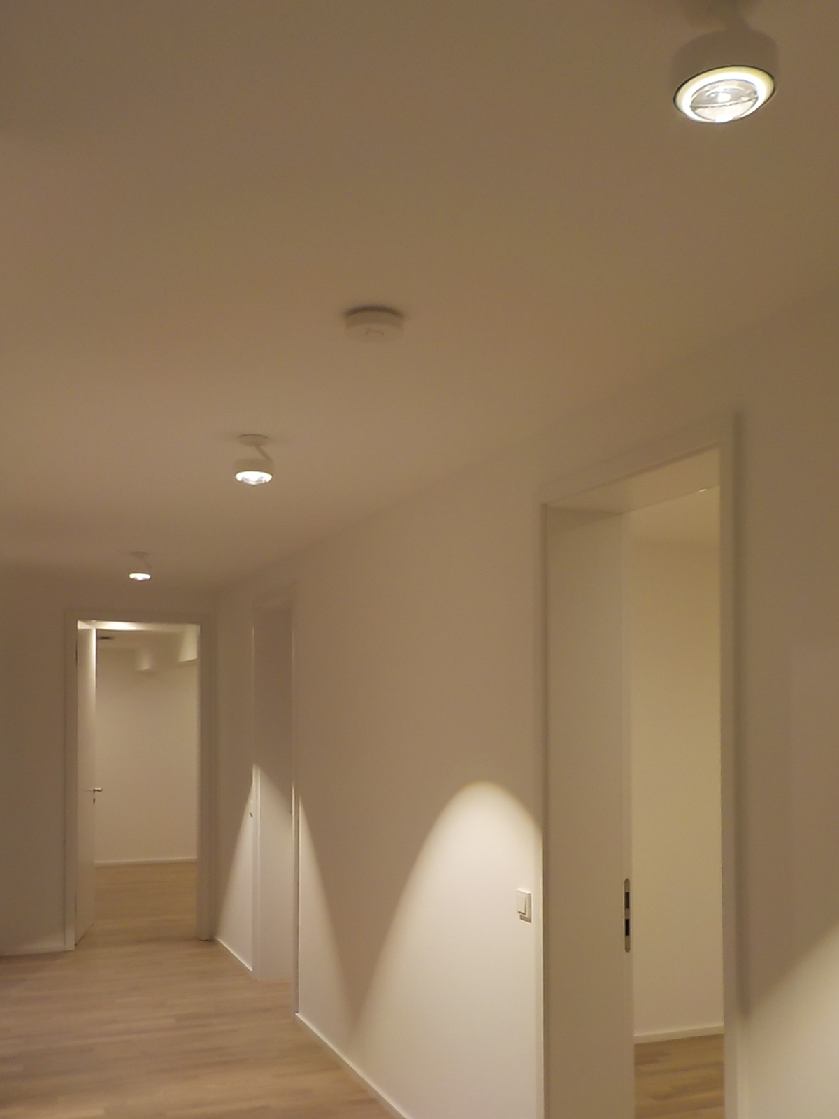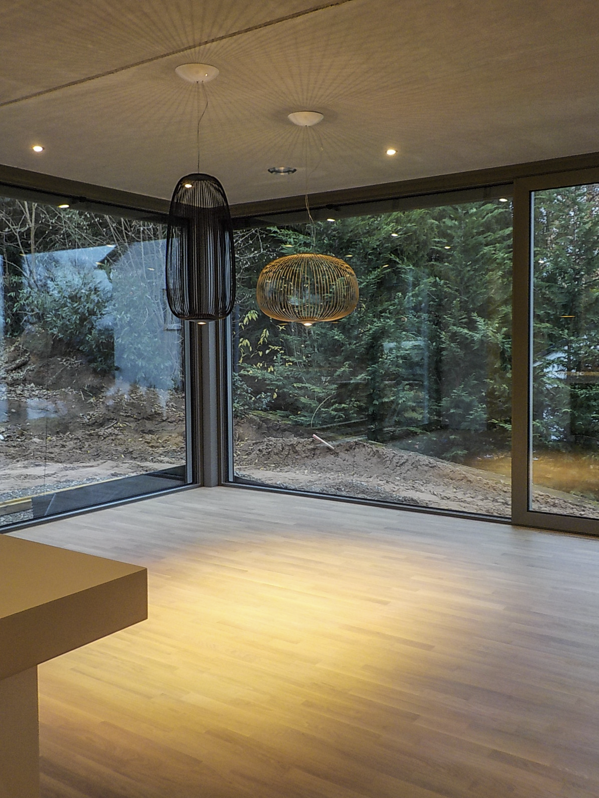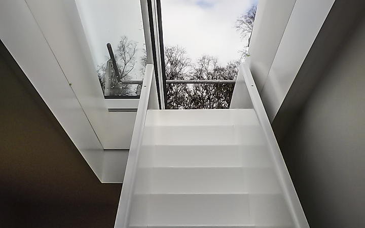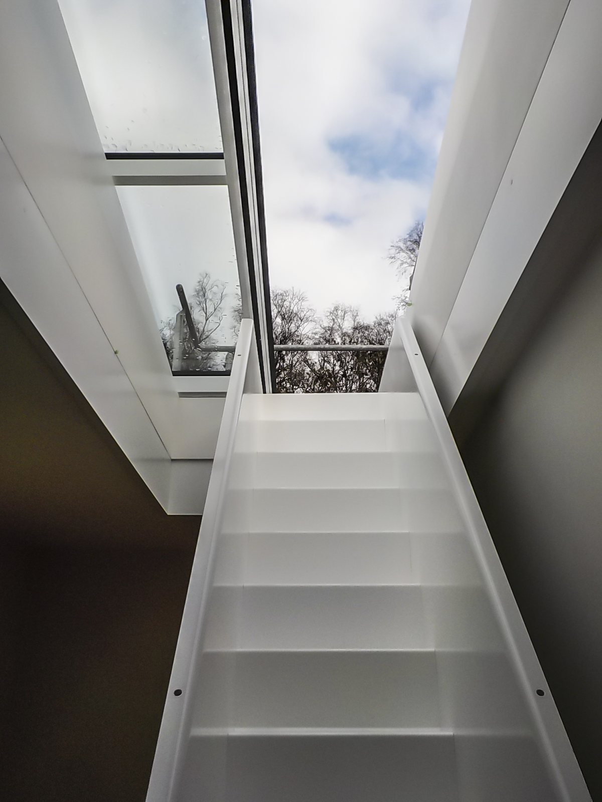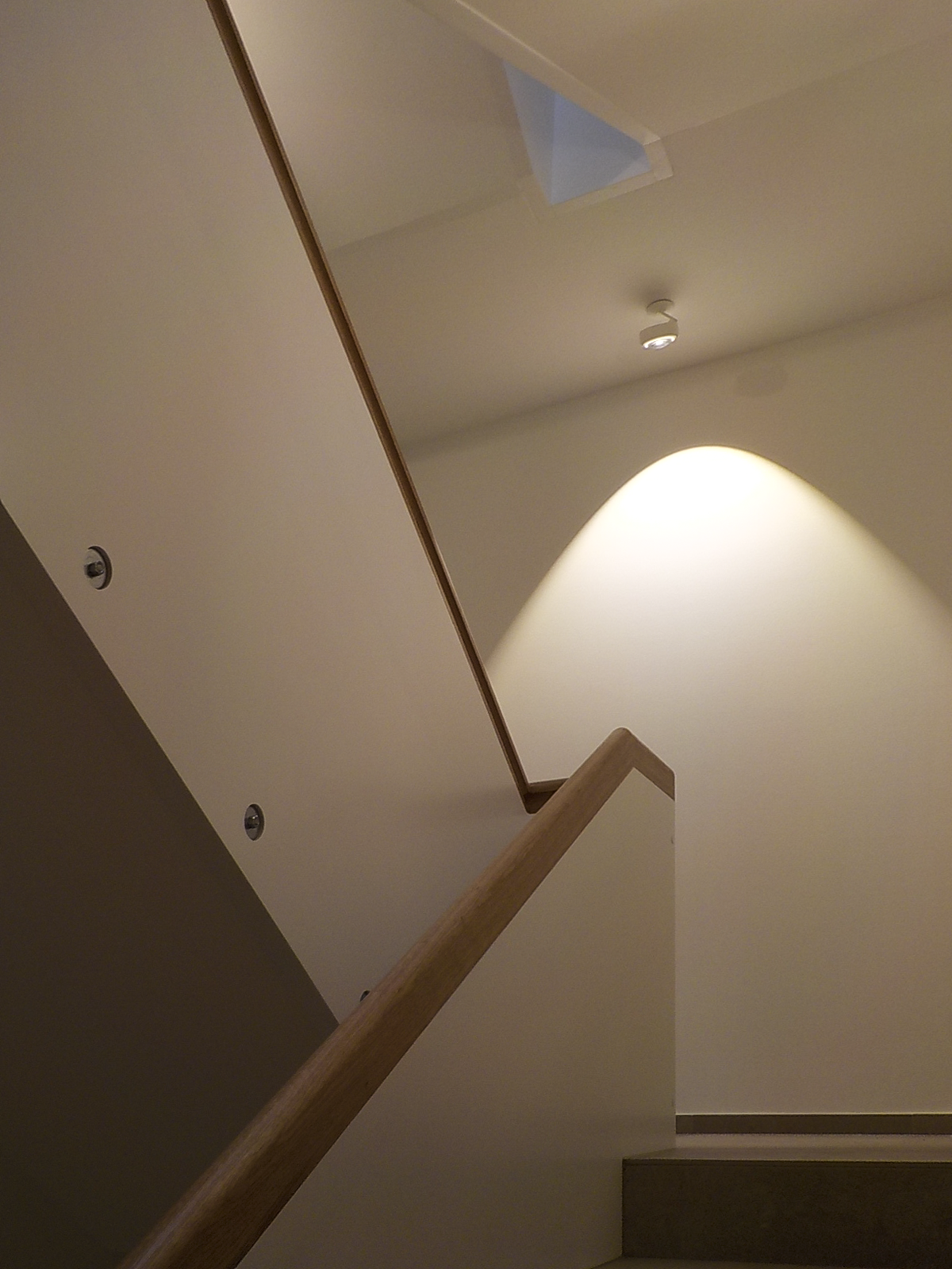 Im Wechsel der sich übereck zu Garten oder Stadtseite öffnenden Wohnräume steht den Bewohnern ein großzügiges Raumangebot zur Verfügung. Die über 3 Etagen laufende Haustreppe findet mit einer weißen Stahltreppe zum Dachfenster ihre Fortsetzung.