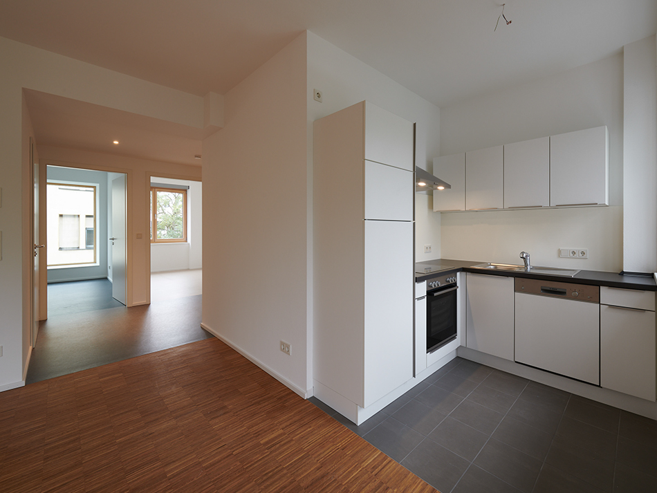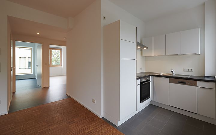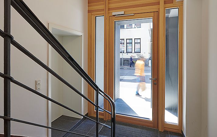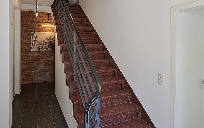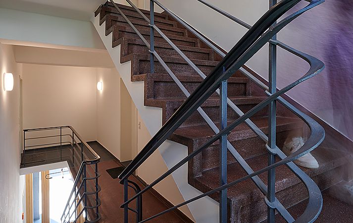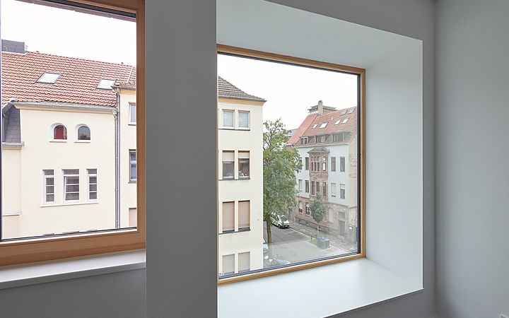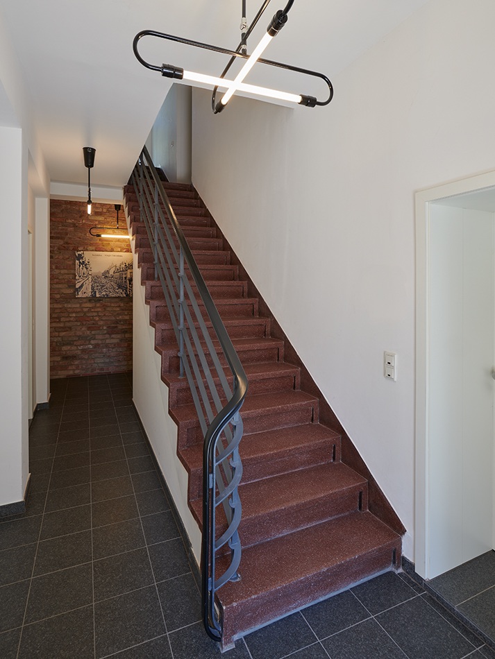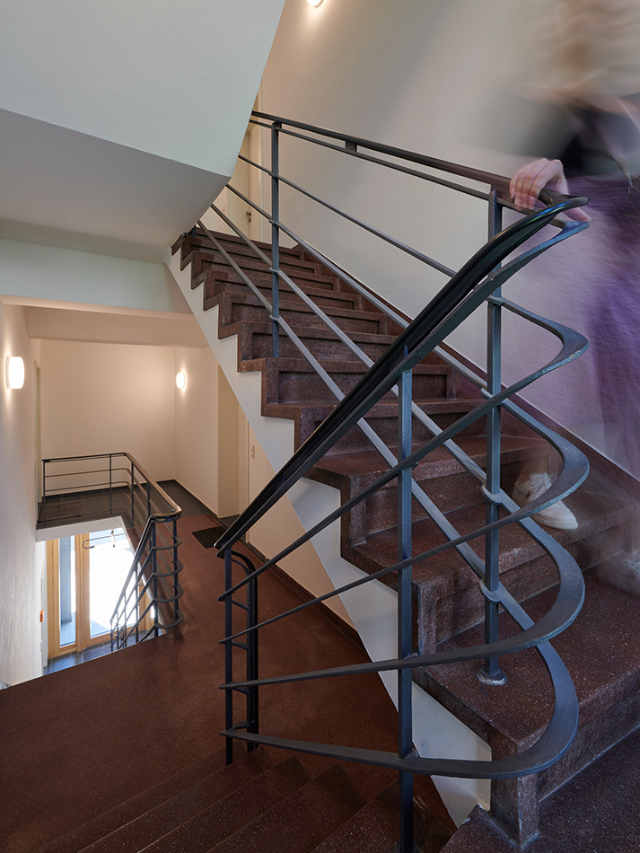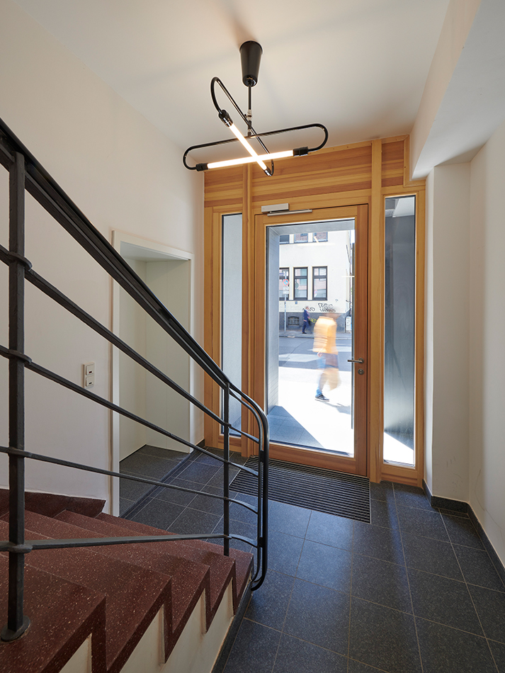 Alle Fensterteilungen wurden beim Umbau verändert. Die mittige Achse der Fenster zur Straßenseite wurde im 1.OG bis 3.OG in der Höhe und im Dachgeschoss komplett verändert. Auch die hofseitigen Fenster wurden in Breite und Höhe verändert. Die neuen Fenster haben Rahmen aus Holz im Vergleich zu den Stahlfenstern aus der Bauzeit. Die Rahmen um die Fensterbänke sind so breit, dass man darin sitzen kann. Hofseitig wurden Balkone wie ein Regal vor die Fassade gestellt. Das Treppenhaus mit der einläufigen Treppe, die vom Foyer zum Treppenhaus führt, wurde in den schönen Details der Nierentisch-Ära wieder herauspräpariert. Eine elegante Wendeltreppe aus Stahl erschließt die oberen Ebenen der Maisonette-Wohnungen. Stäbchen-Parkett verleiht den Wohnungen Wohnlichkeit.