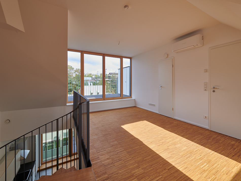 Über dem mit Metall-Paneelen verkleideten Staffelgeschoss liegt nach dem Umbau eine fünfte Ebene mit Austritten und Blicken über die Innenstadt von Saarbrücken. Das Staffelgeschoss im 4.OG war ein Wohngeschoss, das Satteldach war „kalt", also nicht isoliert. Das 4.Obergechoss mit Dach wurden abgetragen und als Maisonetten neu errichtet.
