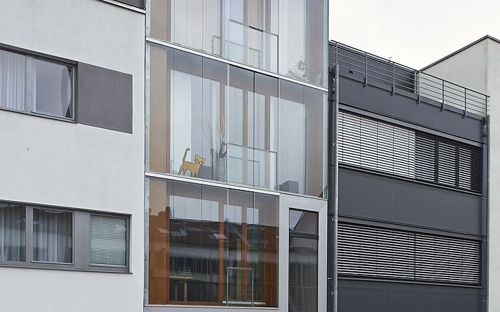 Die nach Nordwesten orientierte Doppel-Glasfassade öffnet die schmalen Wohnräume zum innerstädtischen Straßenraum.