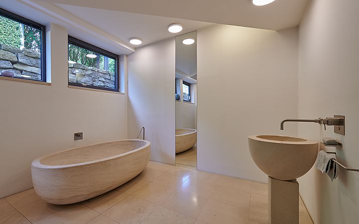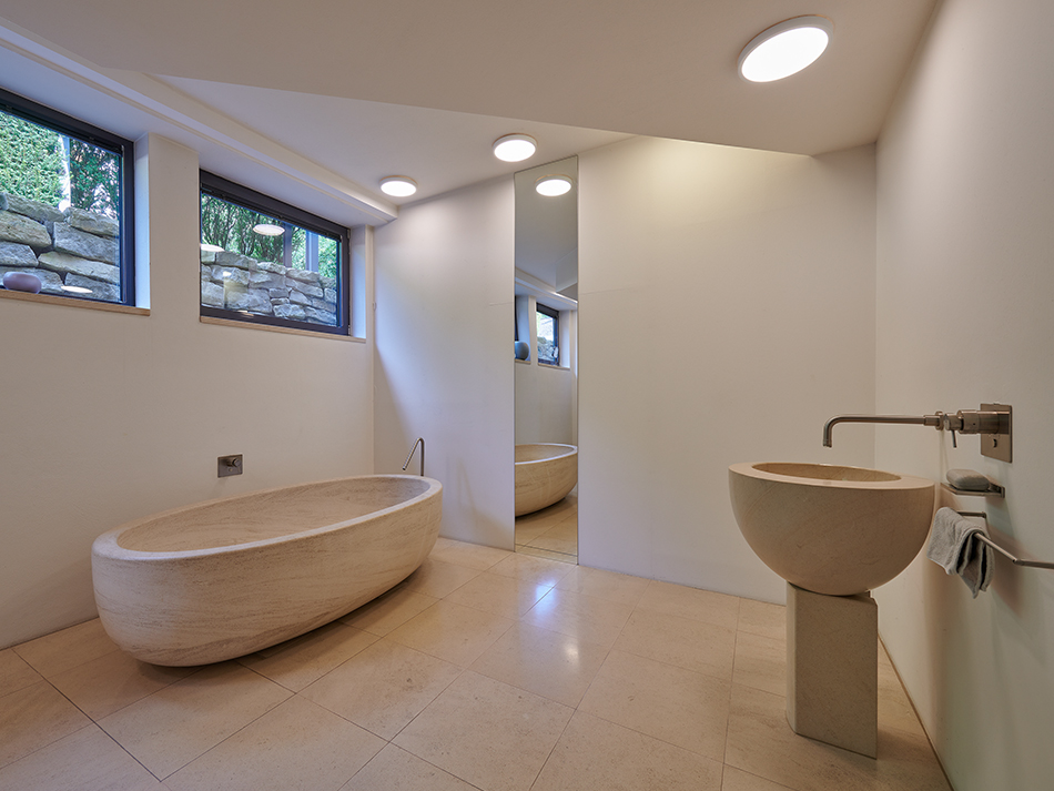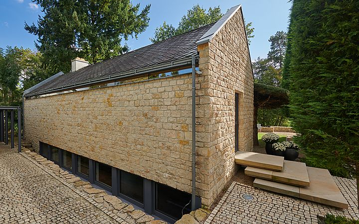 Der Naturstein Kalk begleitet den massiven Gebäudeaufbau als Fassadenverkleidung, Bodenbelag mit Treppe und monolithischen Einbauten.