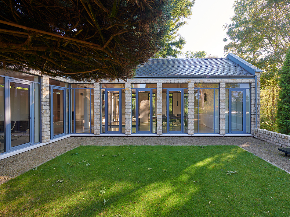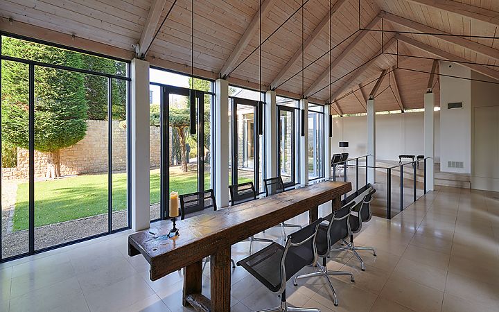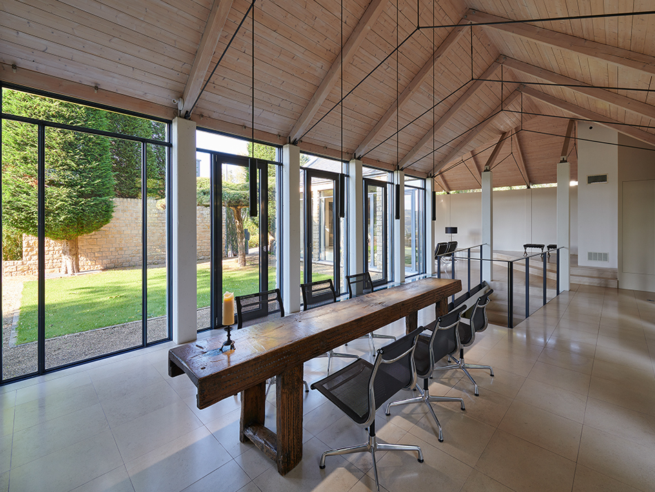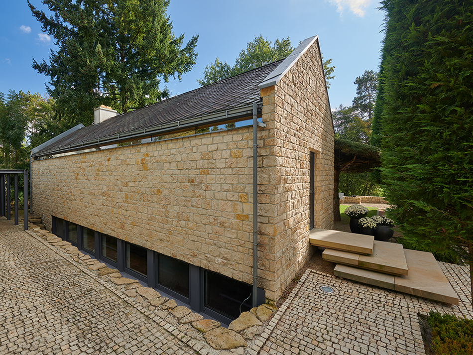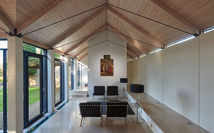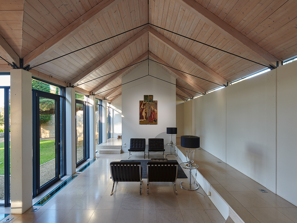 Das Holzbinder-Dachtragwerk mit dünnen Unterspannungen, die Schiefereindeckung, filigrane Stahlfenster und bronzene Türen stärken kontrastreich den Entwurf.