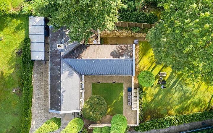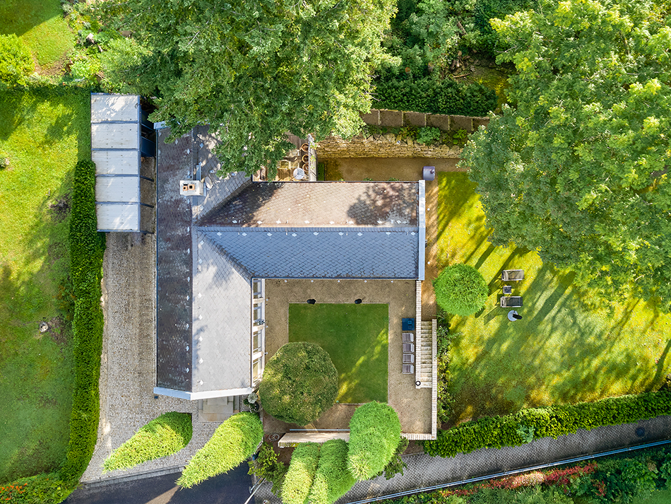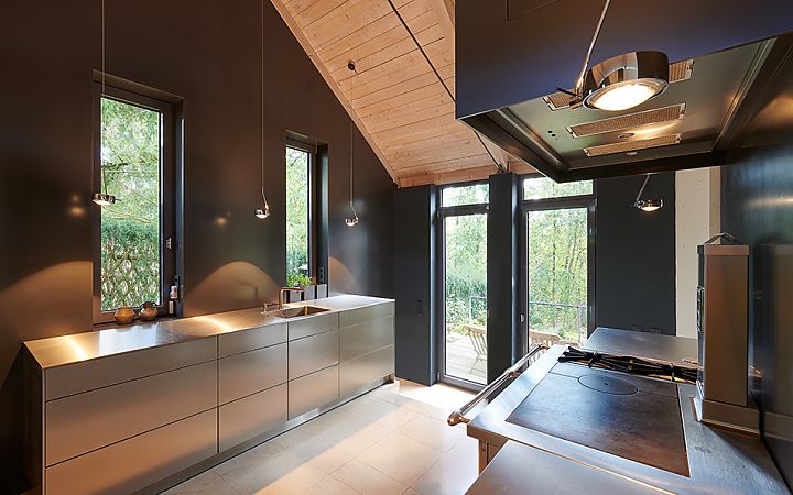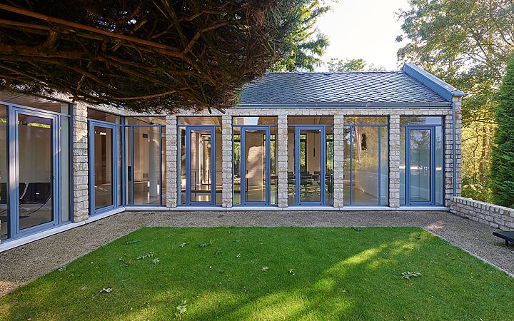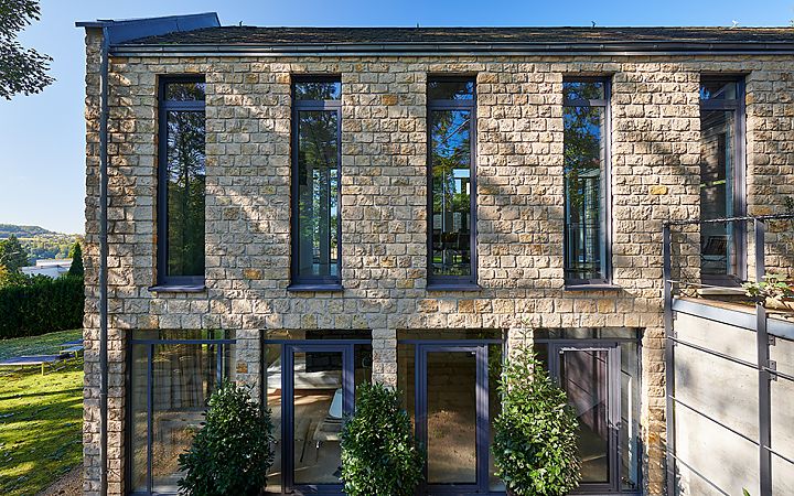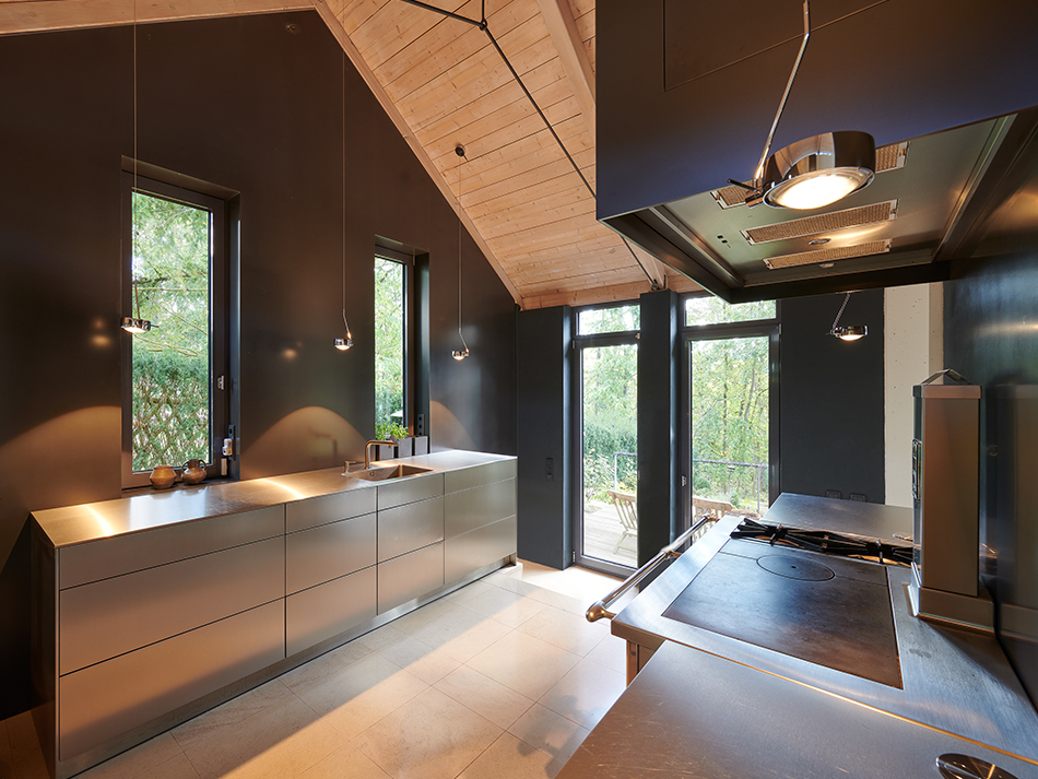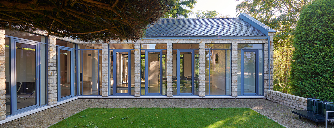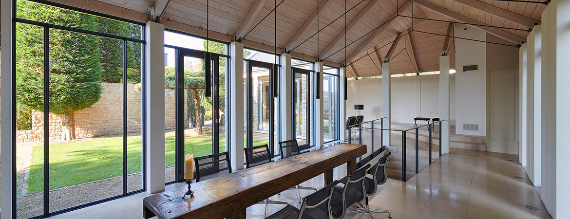 Das Holzbinder-Dachtragwerk mit dünnen Unterspannungen, die Schiefereindeckung, filigrane Stahlfenster und bronzene Türen stärken kontrastreich den Entwurf.