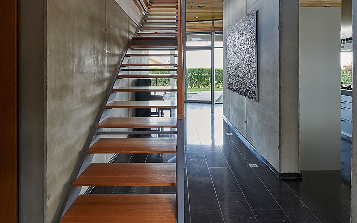 Das Obergeschoss schwebt als Stahlkonstruktion mit vorgefertigten Holzelementen und Metalldach quer über dem Sockel. Aufgereihte Wohn- und Schlafräume mit breitem Holz-Balkon und Dachterrasse bieten den Nutzern einen intensiven Bezug zur Hochwald-Landschaft.