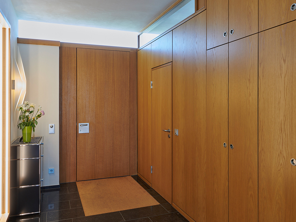 Das Erdgeschoss erschließt das schmale Grundstück in seiner großen Tiefe und nimmt Eingang/Doppelgarage, Küche und Essraum, Nebenräume und Arbeitszimmer auf.