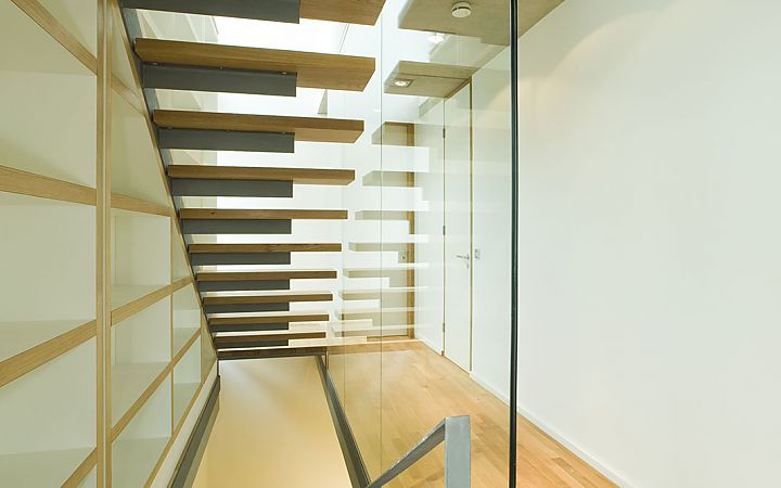 Das Wohnhaus nutzt eine Baulücke in einer dicht bebauten Wohnstraße im Saarbrücker Stadtgebiet. Zur Süd-Orientierung von Wohnräumen und Garten ist der Grundriss mit seinen 2 ½-Etagen quer zur Straße angeordnet.