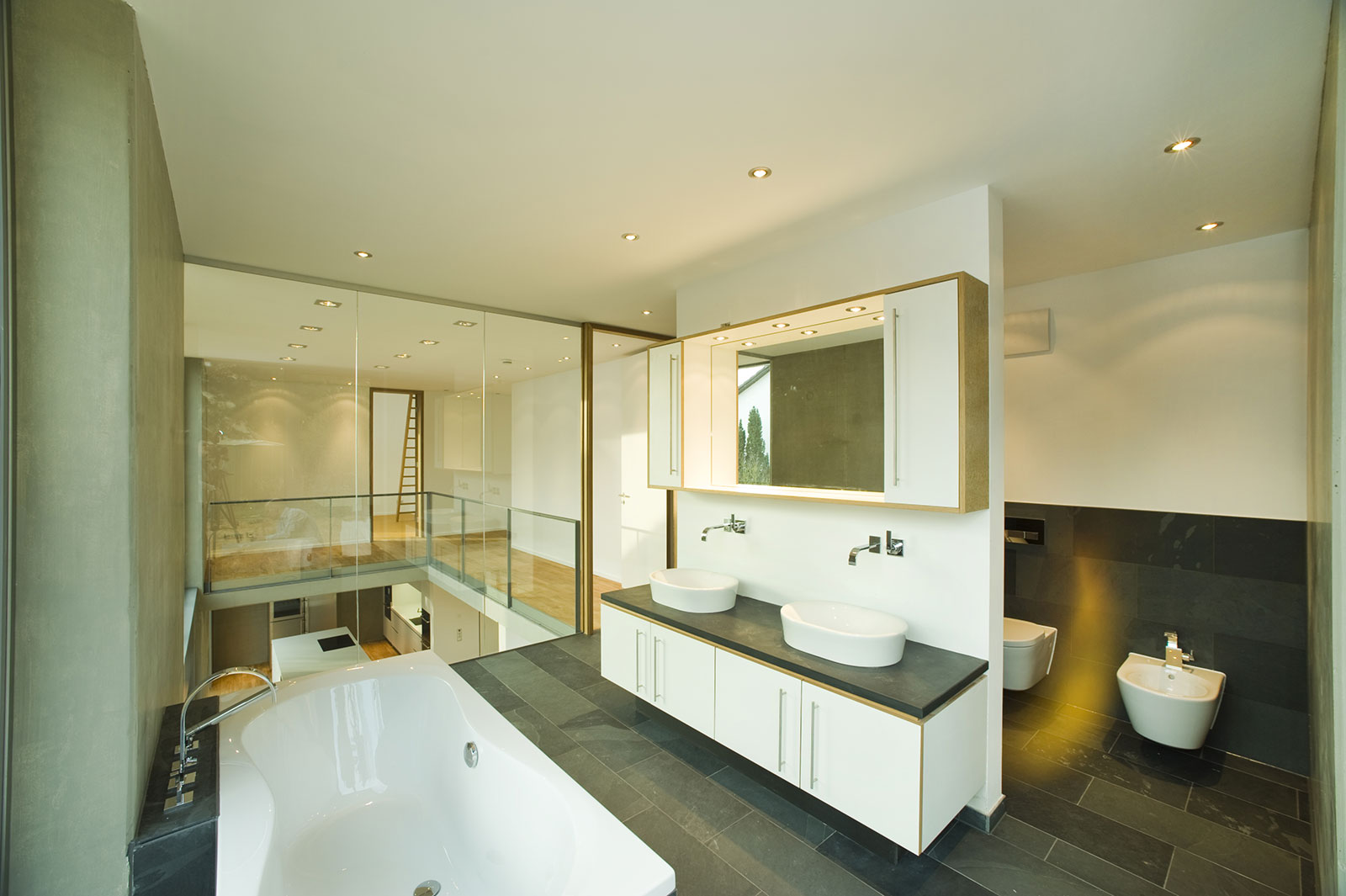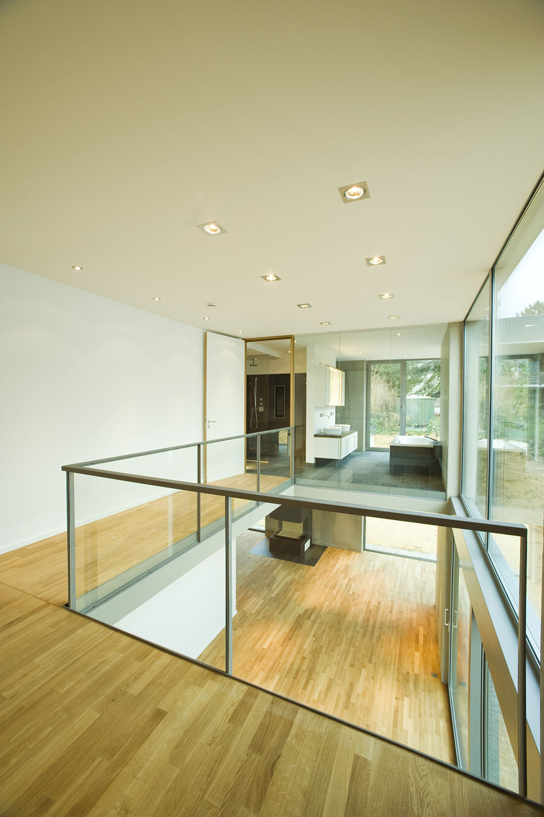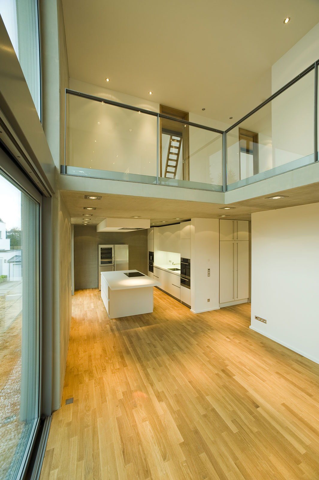 Vorgefertigte Betonelemente für Außenwände und Decken bilden mit großen Öffnungen für Fenster und Galerien ein offenes Raumkonzept.